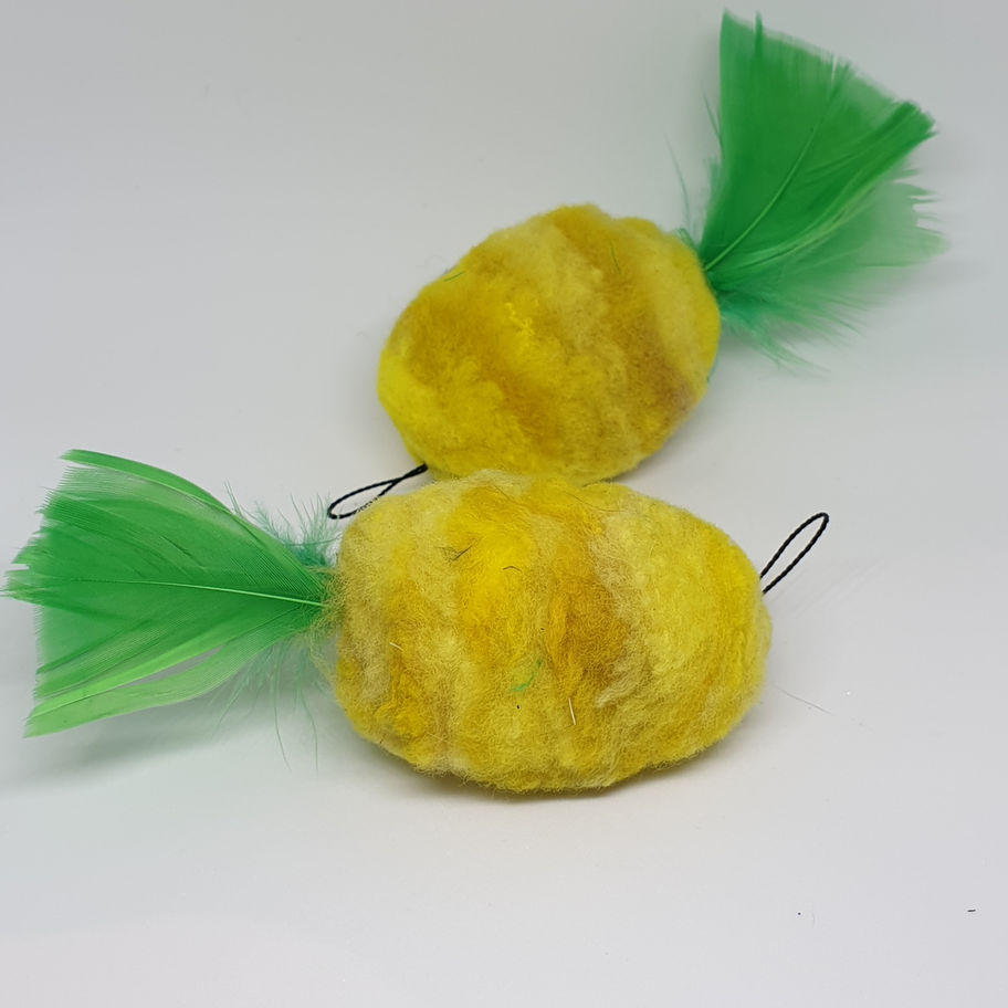 When life gives you lemons, make lemonade. Your cat will love making lemonade chasing and batting the Luscious Lemon cat wand attachment toy.The Luscious Lemon cat toy is made of 100% wool with a green feather stalk.Attach it to your Purrsuit, Da Bird or Frenzy cat wand and let the fun commence!Pack includes one toy.