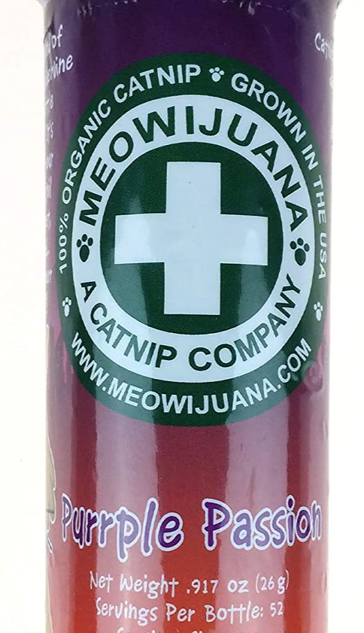 Meowijuana Purrple Passion is a potent blend of heady catnip and silvervine combined into one bottle of feline freakiness! It will have your fluffy furball positively purring with pleasure!